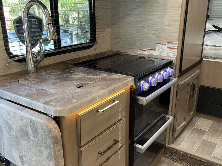 Large refrigerator and three burner stove with oven along with enough cupboard and countertop space to recreate your home kitchen. Power hookup is 30amp.