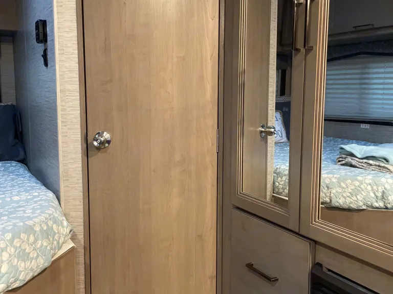 Maggie Mae is in fantastic condition! Floor plan is perfect for anyone wanting to enjoy a stress free vacation. The dinette features a table top charging station, and one handed ease of lowering for a double bed. Roomy bathroom with tall skylight in the shower and handheld shower head makes for an easy clean up for the day. Gorgeous full awning with led lights for hanging out at night including a step light so you can find your way into the rv with ease. Large tv that swings out from the huge bunk offers everyone a view to watch their favorite show. There are so many amenities to offer with this gem. Corner bed offers a large entry and great comfort for sleep along with two beautiful windows. The top bunk is huge and offers cup holders and a window. There is a closet to hang clothes and a large drawer below for towels and washcloths.