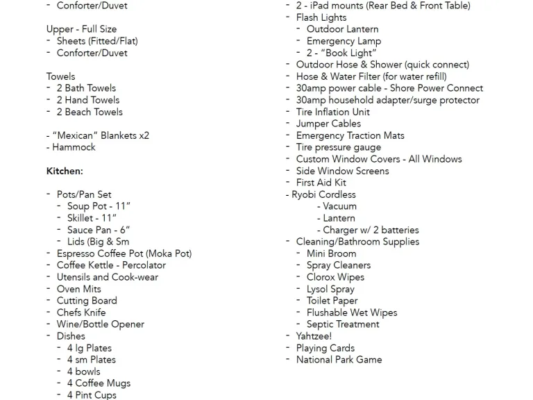 What's includedHOP IN AND GOThis van is considered “road trip ready.” Whether you are flying in from out of town or looking to explore your own backyard, all you really need to do is stop for groceries before hitting the road. All cookware and tableware is included, as is bedding and a wide array of camping gear.• You’ll be sent a detailed list of all the items included in the van before your trip so you can plan accordingly.Recommendations• I love getting people going on their adventures. I have prepared a few PDFs of travel tips fr destination like Joshua Tree and Big Sur. I look forward to giving you personal attention and advice along the way.