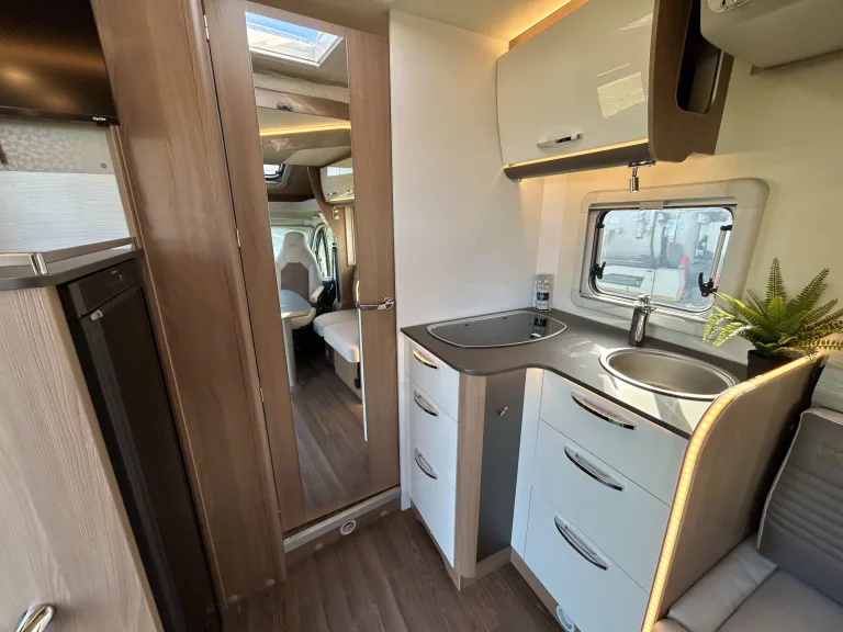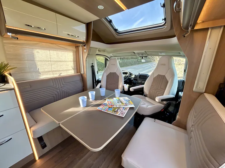 Ce véhicule dispose d’un coin toilette avec WC chimiques et lavabo, ainsi que d’une cabine de douche indépendante avec eau chaude. Un agencement pratique qui vous garantit une vraie autonomie, sans avoir à dépendre des infrastructures de camping.Grâce à sa cuisine équipée de deux plaques de cuisson, d’un évier et d’un grand réfrigérateur avec une partie congélateur, vous pourrez profiter de bons petits plats cuisinés autour d’un salon spacieux, sans comptez les sièges avant pivotants qui agrandissent davantage cette joyeuse tablée !