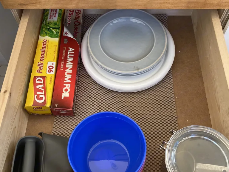 - Kitchen utensils, pots/pans, plates, cutlery, cups and mugs, trash bin