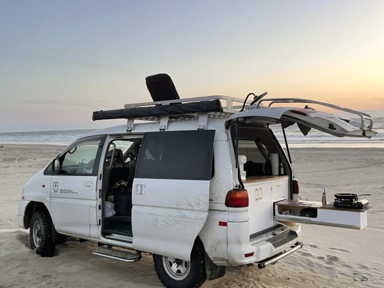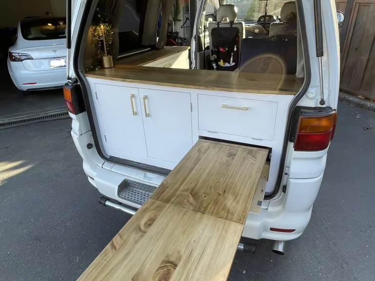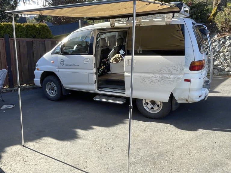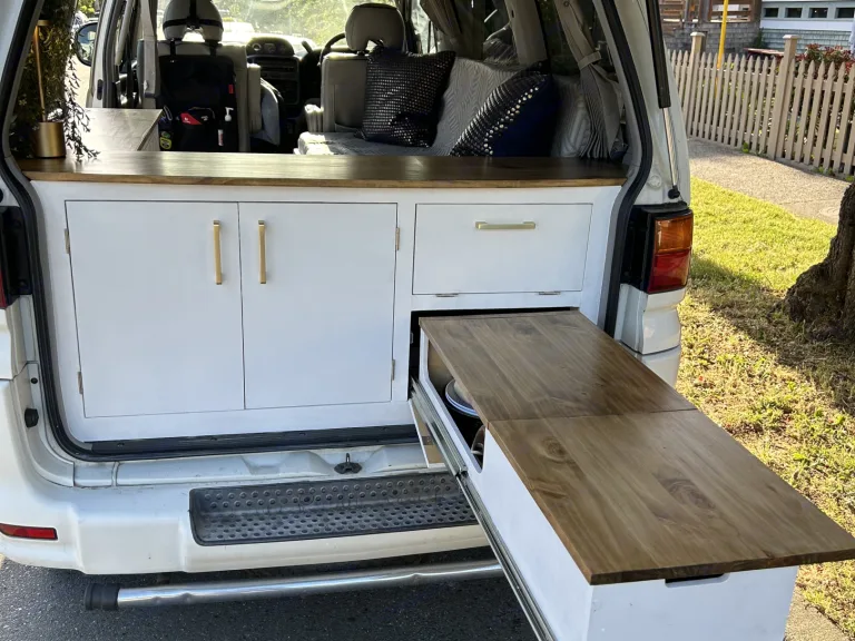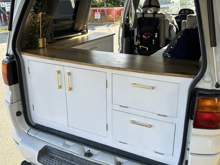 This 1999 Diesel Mitsubishi Delica is a well-maintained vehicle that runs flawlessly. Customized with a spacious interior, designed for road trips, stealth camping, and exploring the beauty of Vancouver Island.The cabinets are custom built and designed to maximize window views while providing easy access from multiple entry points. They feature finished wooden countertops with 12V power outlets, USB, and Usbc ports that work with the power add on.// Power Add-On //