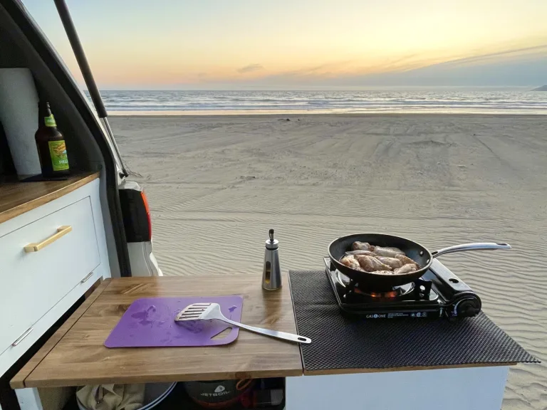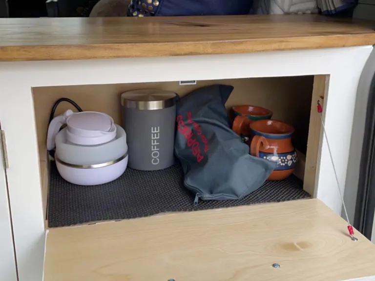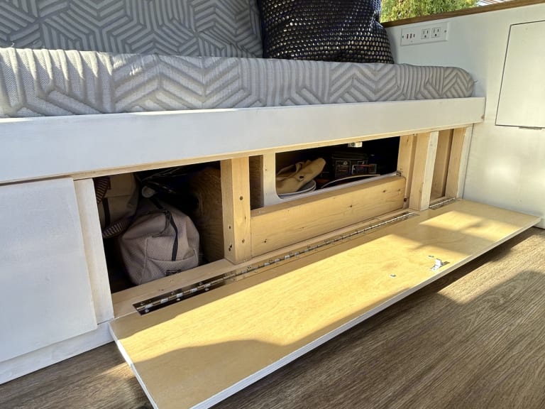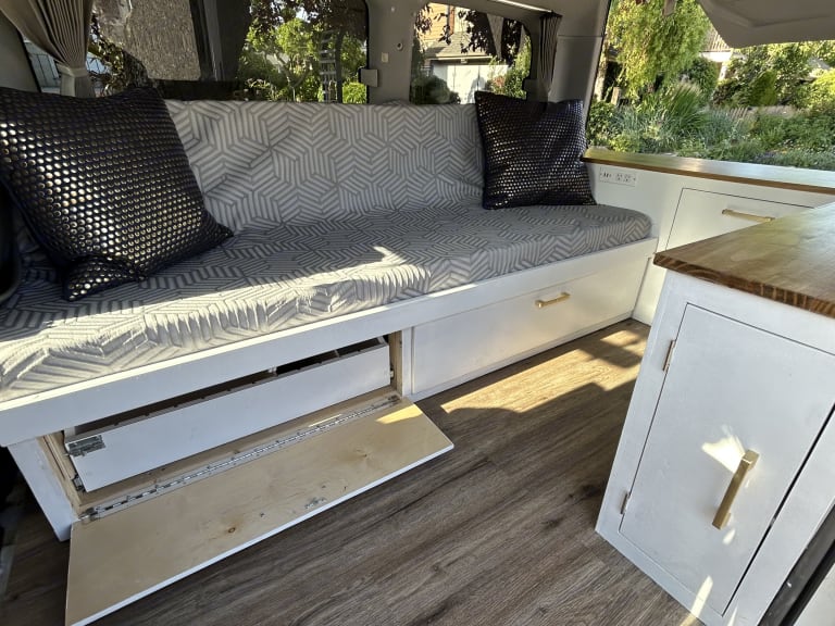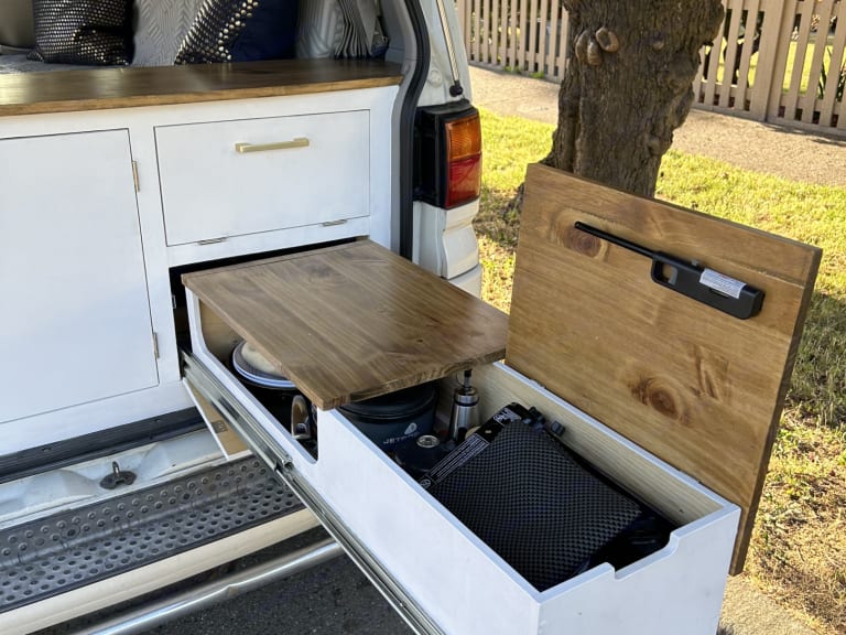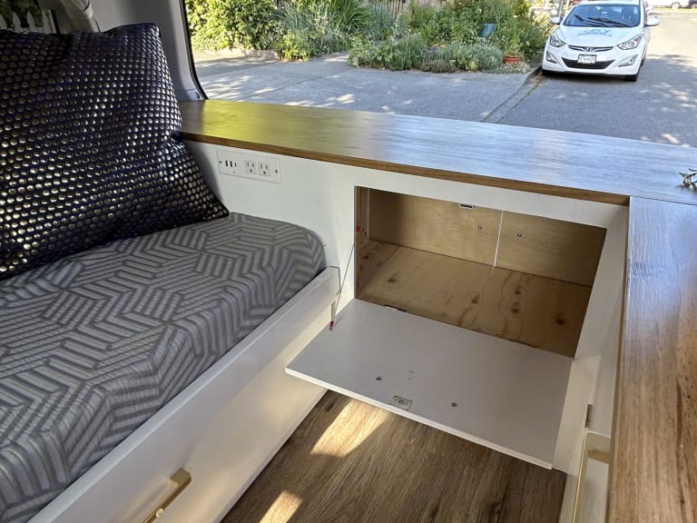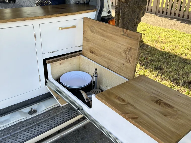 12v, 23 quart compressor refrigerator or freezer. Works while engine is running or with the: 'Power Add-On'.The couch easily transforms into a twin bed by simply pulling it out like a drawer. Sleeping two is possible, however it is fairly tight. Under the bed, there are large storage compartments on drawer slides, allowing for easy access to your belongings from inside or outside the van.The kitchen area, located at the rear, can be accessed by lifting the hatch/door, which also serves as a cover during rain. It features cabinets, shelves, and a 40 inch glide-out compartment for extra counter space. The pull-out counter contains everything you need, from cookware and utensils to spices and oil.For additional storage, there is a large roof rack that can be accessed by a ladder at the rear of the vehicle. (It also makes for a pretty great sunset-watching spot).Embark on your next outdoor adventure with the convenience of mobile island accommodation.What's included- 2 Compact Camping Chairs