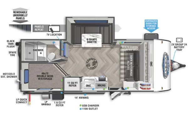 • The outdoor grill uses propane, and the on/off switch is located at the base of the camper under the outdoor kitchen. Be sure to turn off the switch when not in use!