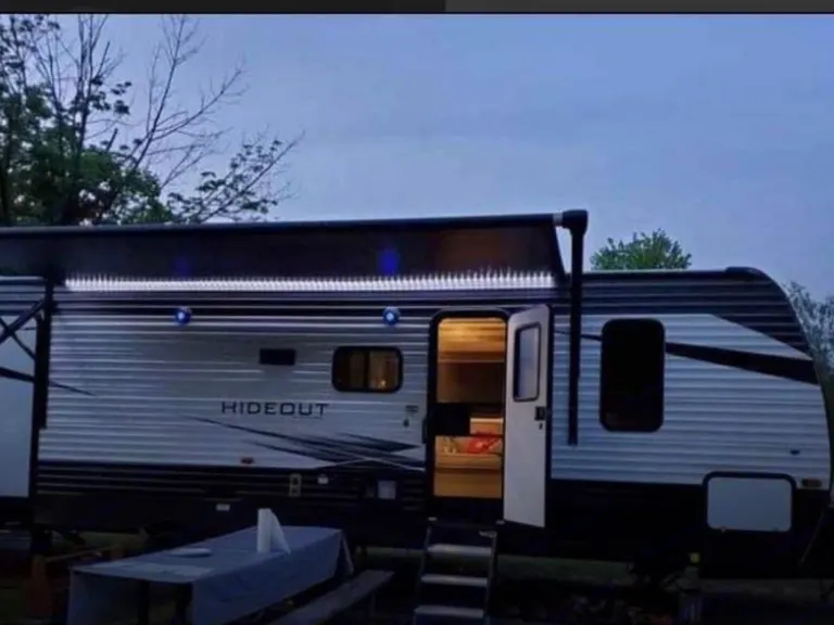 Enjoy your Hidden Adventures with this 27’ travel trailer with a super slide. This trailer will accommodate 10 people utilizing a bunk house style layout that is spacious and friendly. The kitchen table along with the scissor couch allow for extra sleeping accommodations. The master bed room features a queen bed along with dual sliding doors for privacy. This model also offers an entry directly to the bathroom as well. Enjoy the electric fire place along with the central vacuum system! Tons of amenities will be offered such as linens, utensils, plates, coffee maker, toiletries, towels, wash rags, cleaning supplies, cooking supplies, cords, power adapters, leveling blocks, and other misc. items. This camper also offers a power jack system for leveling as well. Everything that you will need to go camping will be included besides chairs.What's includedFresh linens, blankets, pillows, towels, plates, cups, utensils, coffee maker, basic necessities. Some toiletries, additional blankets, cleaning supplies, and paper towels.RecommendationsRelax and enjoy your vacation! Other things to noteNo smoking in this rental please