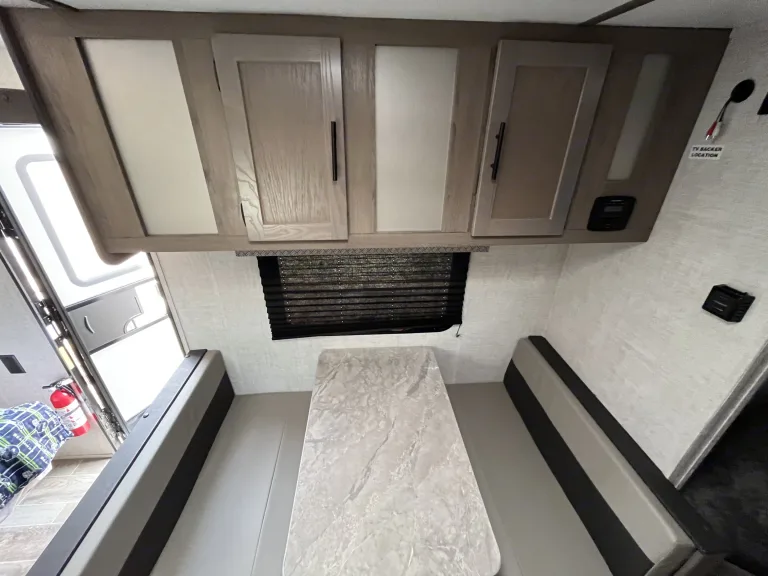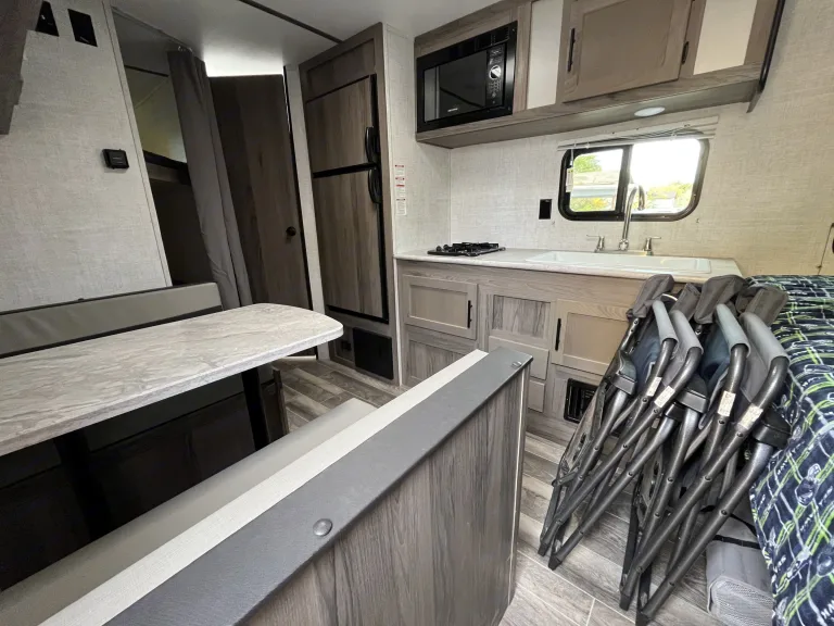 Sleeps 5 comfortably, one Murphy style couch/bed (queen) and full size bunk beds, and a dinette conversion bed, shower, toilet, sound system, small solar kit, fridge/freezer. Taller head room! I’m 6’6” no ducking!What's includedCamping chairsRecommendationsBring own bedding and food/garbage bags and utensils. Other things to noteNo Smoking! No Pets! Respect the trailer!
