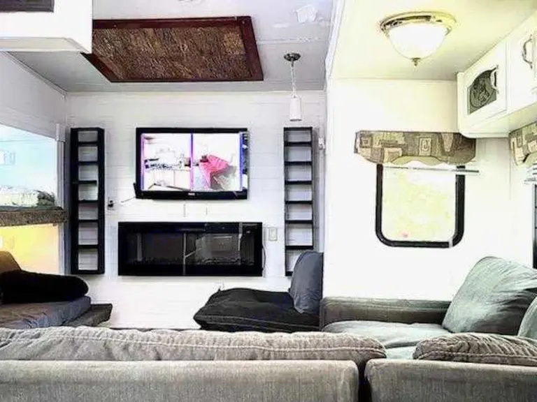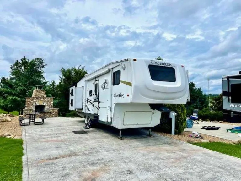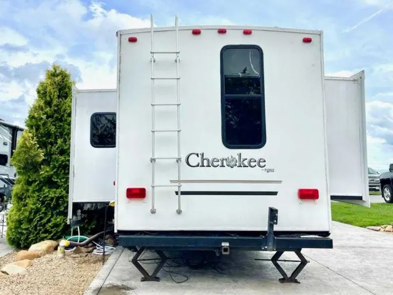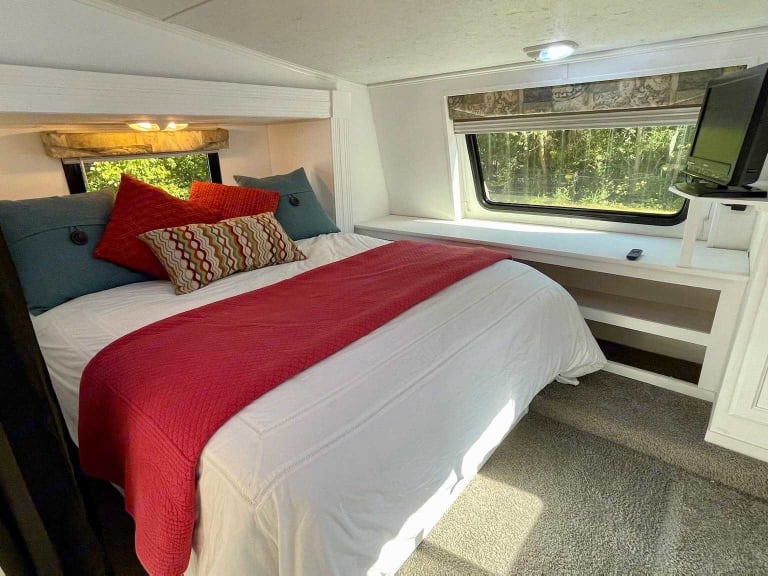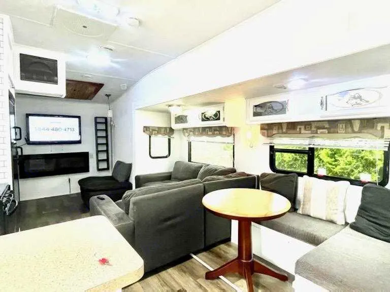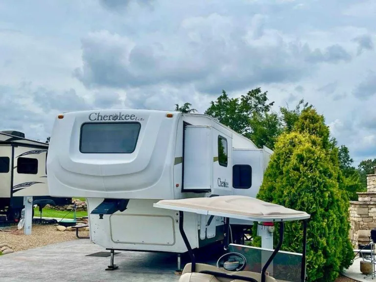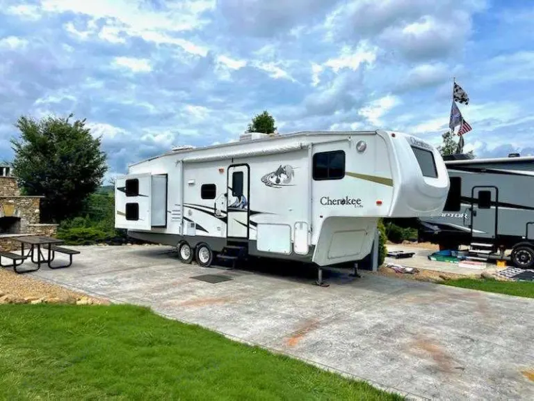 Enjoy our 35' three slide out travel trailer which is set up at a small Campground in Maggie Valley North Carolina.This RV is on a lot right on the creek with an enclosed outside porch and a deck overlooking the waterMake unforgettable memories with your family. Our spacious trailer with 3 slide-outs can accommodate up to 6 people. Pictures will be updated once permanent set up at the Campground is completed. Displayed Pictures are recent of the actual RV located at another RV park IN TN. Currently it is being set up a our RV park in Maggie Valley for permanent stationary short term rentals which saves our customers the delivery fee and lot rentals at other RV parks..Queen size bed in the bedroom, 2 bunk beds and a comfortable couch. It has cookware, dishes, utensils, coffee maker, toaster, camping chairs and a charcoal grille. The kitchen has everything you need; double sink, 3-burner propane stove, microwave, refrigerator. Small pets up to 25lbs are welcome.The community area of the RV contains L shaped comfortable goose down couch, TV and Fireplace. Start your day with a fresh cup of coffee using the Coffee machine.You can go to all the nearby vacation and recreational areas like Smoky Mountains, Cherokee, Gatlinburg and Asheville.