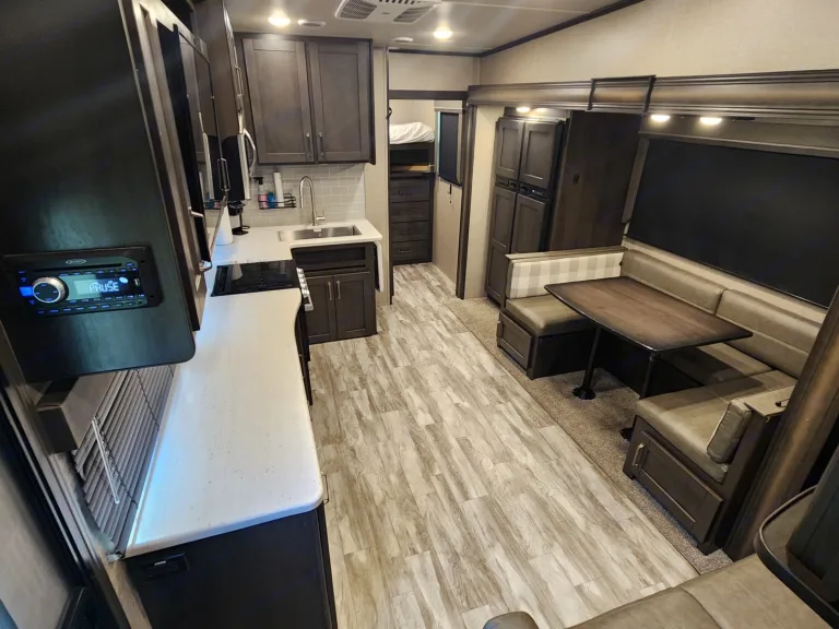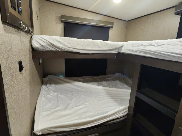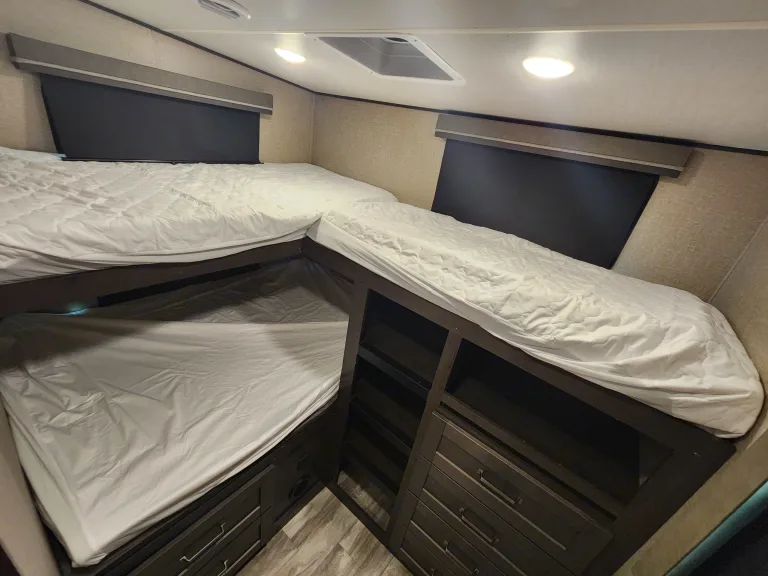 Welcome to Jo Dee!!!!This fantastic camper is great for the whole family!!!With an amazing bunkroom space with tons of storage, and oversized beds for everyone!!!The kitchen, living and dining space are incredibly spacious with so much counterspace to prep all the amazing meals!!!The bathroom is incredible with tons of storage and large shower!!The master bedroom is a dream with all the closet space you could possibly need for a great trip!!What's included• What's included:• Each bed comes with a fitted sheet.