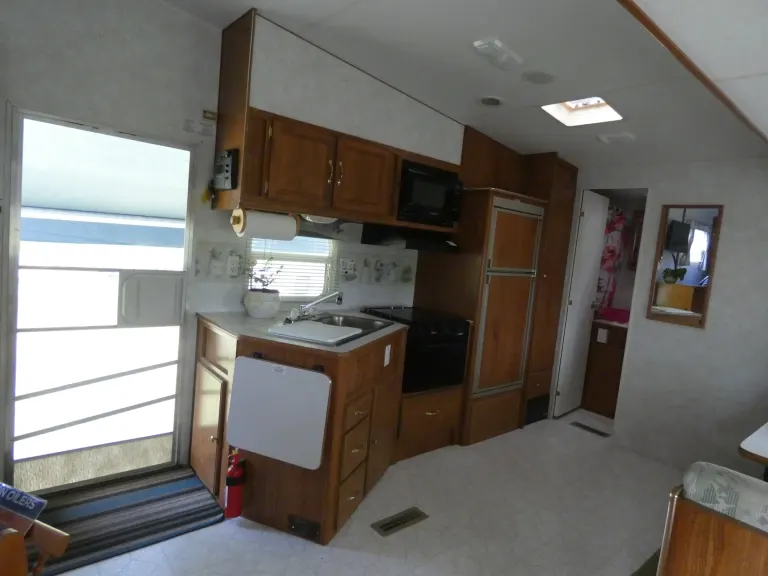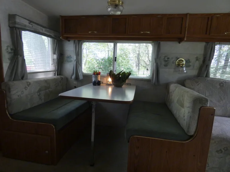 Comfortable, roomy trailer with a pop-out for extra space. Comfortable for 4 adults or 2 adults and up to 4 children. Everything you need for your vacation household is available: plenty of cookware, storage space for clothes. Coffeemaker, electric kettle, toaster oven in addition to stovetop, oven, microwave, fridge, double sink. Dishes, glasses, cutlery, cooking utensils and BBQ tools.