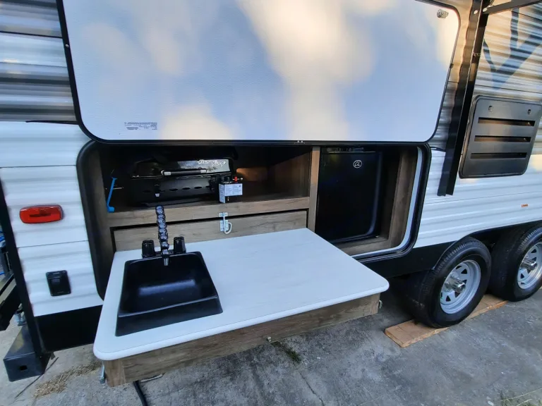 when you wake roll out the awning with the touch of a button, instant shade, relax and grab your favorite beverage from the out side kitchen. nothing like it,