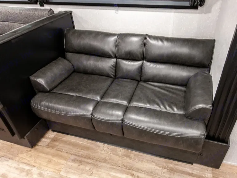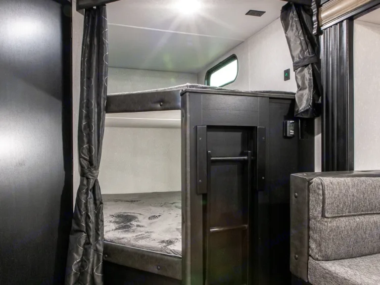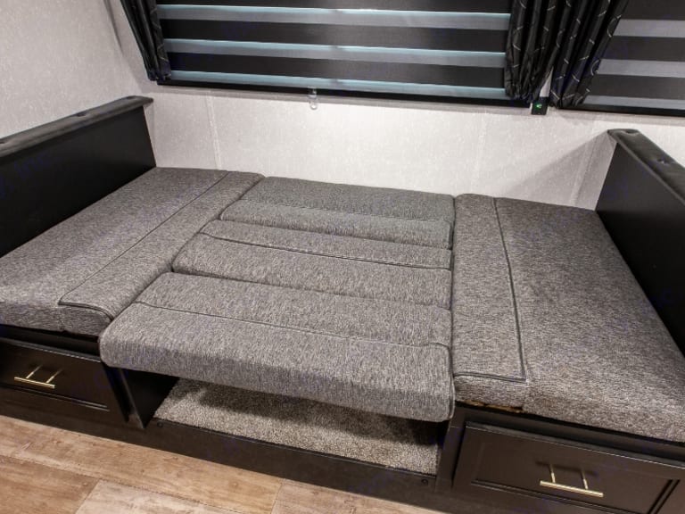 this brand new grey wolf 26 DBH is a Perfect family travel trailer . Queen bed , double size bunks . roomy bathroom with door to outside . large kitchen with u size dinette that folds into a bed and a love seat that also converts into a small sleeping bed .