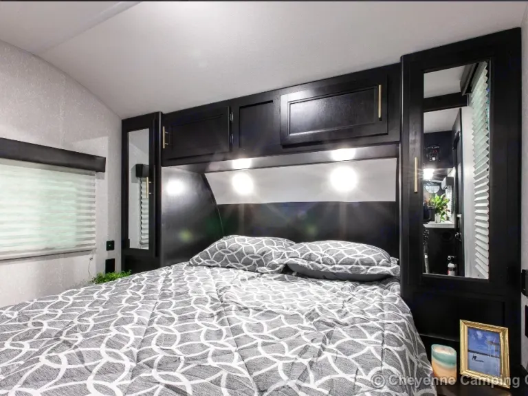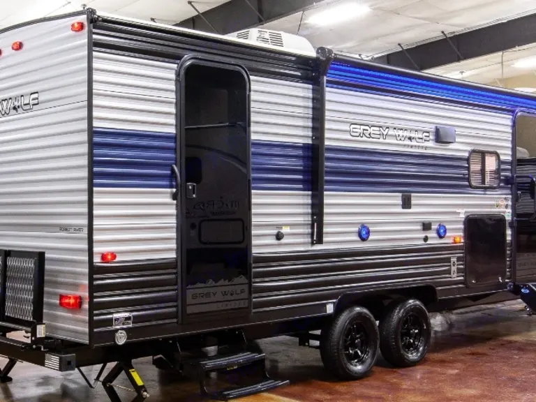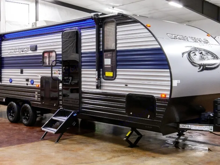 This sweet family unit is perfect for the whole family . Beautifully laid out for comfort with the whole family in mind. queen master bed room with sliding doors, two closets and usb charging ports. Kitchen / living area has a fire place with changing flame colors for those cool summer nights . a love seat that folds out for extra sleeping dinette that also converts . 12 volt fride with freezer . double size bunks that can fit 2 on top and 2 on bottom . nice size bathroom with door to the outside . out side there is a Kitchen with a flat top grill and mini fridge . As with all our units they come stocked with most everything you would need for a great camping experience