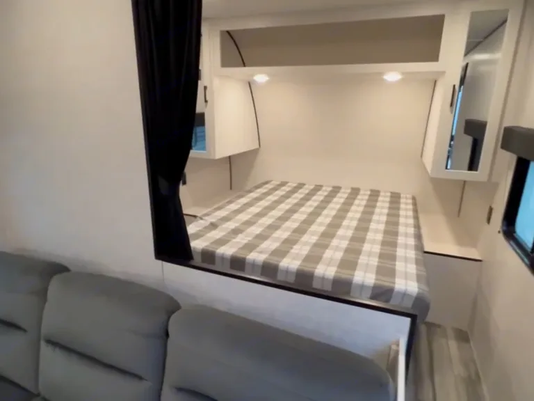 Cozy rv rental interior: Queen bed with plaid bedding, overhead cabinets, a sofa, and windows create a compact living space.. Jayco Jay Flight SLX 2025