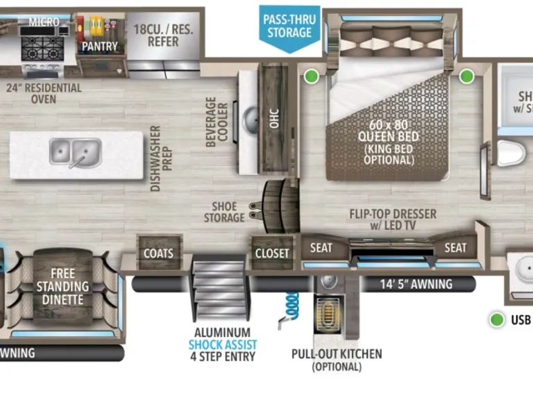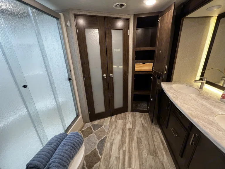 The Memory Maker is a very comfortable 5th wheel with all the amenities included of home. Its the best of both worlds because you're not giving up the comforts for the memories made while camping. We love to travel but also like our luxuries. This unit is loaded with high-end components. It has a wine fridge, wet bar, washer/dryer, hall tree for your coats/outdoor wear when entering, outdoor pull-out kitchen with Blackstone griddle and sink, dishwasher, full size pantry, fireplace, queen size bed, two recliners, pull-out queen size bed, extra large closet and double vanities in the bathroom. The memory maker has a ton of storage inside and out so you can pack all the gear needed for that special or adventurous trip. It also has the option to use the generator if needed. The perfect place to make memories that last a lifetime.What's includedThe camper comes with: