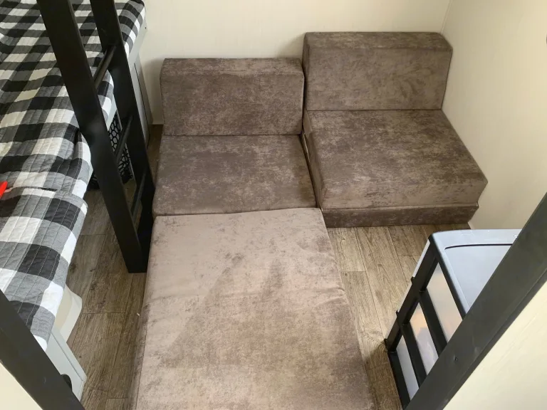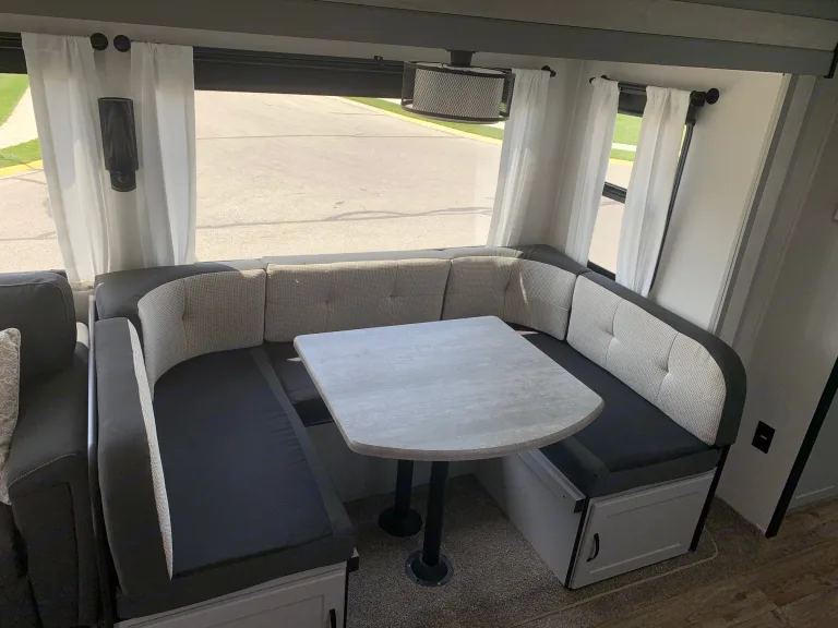 Who has the Vibe to go camping??? Our Vibe is a sleep 10+ that is absolutely perfect for friends and family. Featuring a rear bunk-room, tri-fold sofa sleeper, u-dinette sleeper, with a front queen bed. This rig is outfitted with a super-slide out that is easy to use and adds tons of interior space. Vibe's floorplan is welcoming and cozy offering all the amenities you enjoy at home. These include: a refrigerator and freezer, A/C, furnace, stove-top burners, oven, full bathroom with standing shower, microwave, and an outdoor kitchen with a small fridge and induction burner.Did I mention it has a giant solar panel on the roof powering everything inside except for the A/C and furnace? This make it the perfect dry camping unit capable of powering lights, awning, slide-room, stereo and fans for up to two days on a full charge. As long as the sun is shining, you could power it for longer than that!On the exterior there is a power awning with an LED light strip, power jacks, outdoor shower, and an outdoor kitchen.What's includedThis camper comes packed with everything you need to go camping including hoses, a black-stone grill and griddle, adapters, toiletries, toilet paper, fresh linens, cutlery, plates, cups, napkins, towels, cookware, table, and camping chairs.Pick up and delivery available within 100 miles upon request. Other things to noteNo smoking