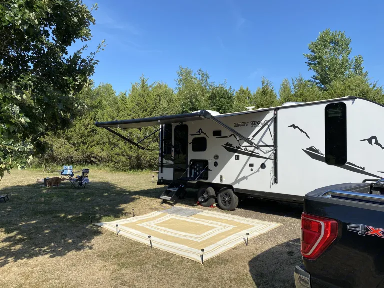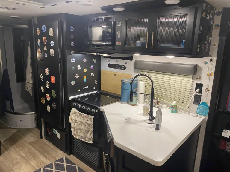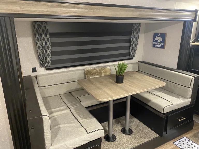 Newly bought and updated travel trailer perfect for your next family vacation or personal getaway! Fit with all the amenities you need including two outdoor showers, outdoor ice maker, awning with lights, and indoor fireplace. This travel trailer is also equipped with a full indoor shower with different pressure and massage settings. Enjoy a movie night and bring your pet with! You can comfortably sleep 6 in this unit.What's includedFresh linens, two camping chairs, Keurig coffee maker, fresh towels, small cooler, basic kitchenware, ice maker, outdoor games including Kam Jam and Cornhole bags/boards. For an additional price rent an inflatable tandem kayak to take with you on your journey!RecommendationsThis rig is perfect for state parks! We love finding a campground by a lake or river and having get togethers with friends and family. Other private campgrounds are easy to fit into as well!Other things to notePets welcome!