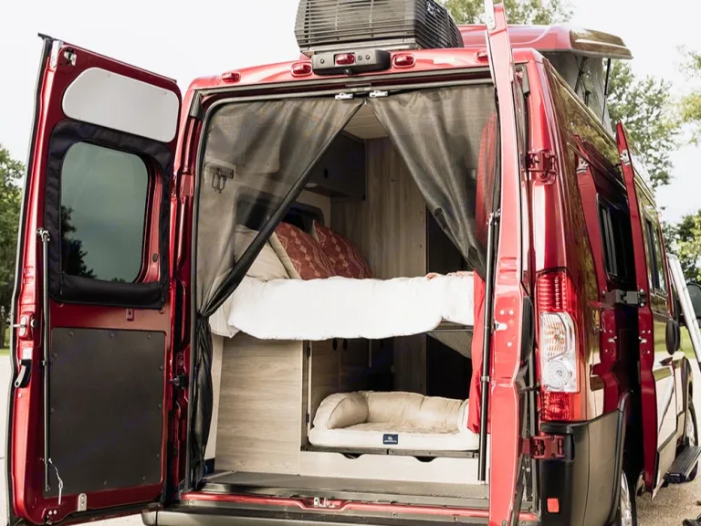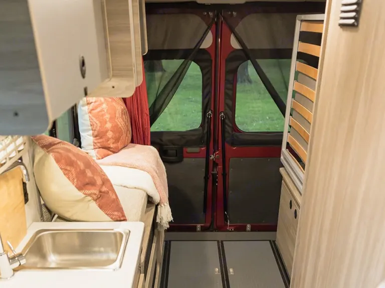 Spacious Sleeping Arrangements: Sleeps up to four with a Murphy+ bed in the rear and a pop-top sleeping area, providing comfortable rest for your entire crew.Well-Equipped Kitchen: Includes a two-burner propane stove, stainless steel sink, refrigerator, and ample counter space for preparing meals on the go.Bathroom Facilities: Features a wet bath with a shower, sink, and cassette toilet, offering convenience and privacy.Climate Control: Stay cozy in any weather with a Truma Combi Eco heating system and roof-mounted air conditioning.Flexible Living Space: The rear Murphy+ bed transforms into a versatile space for dining, lounging, or additional storage, with a removable table and adjustable seating.Off-Grid Ready: Equipped with solar panels, dual lithium-ion batteries, and a Cummins Onan® generator, allowing you to power your adventures even in remote locations.What's included• 1 set of sheets (mattress cover, top sheet)