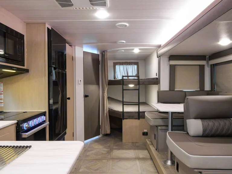 The 263Bhxl is perfect for family travels. The rear features two oversized bunks for the kids, with plenty of space to stretch out. The grown-ups will sleep soundly in the front queen bedroom, which includes hanging closets and under-bed Stow N Go Storage. The living area includes panoramic windows and the Versa-Lounge. The kitchen provides a 11 CU. FT. refrigerator and Tons of storage.What's includedCoffee maker (k-cup), toaster, pots and pans. Other things to noteNo Smoking!!