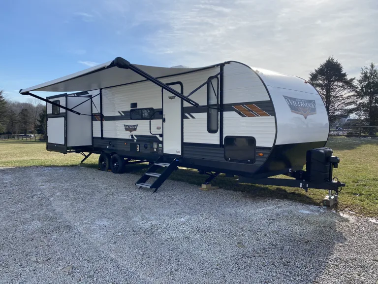 Derecho Unlimited is a 2022 Forest River Wildwood looking to get some miles on the tires and make some memories! It is a spacious, family friendly camper loaded for your destination vacation. The rear bunkhouse has three cot beds along with a queen sofa conversion with all bed linen included. The kitchen features all your basic appliances along with a Keurig to start your mornings caffeinated. Basic kitchenware such as reusable plates, bowls, utensils, pot, pan are provided. If you choose to not cook your hot dogs over the campfire the outdoor kitchen leaves your family with plenty of options. There is a sink, fridge and gas grill at your fingertips.