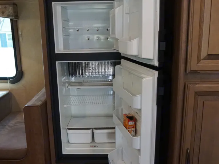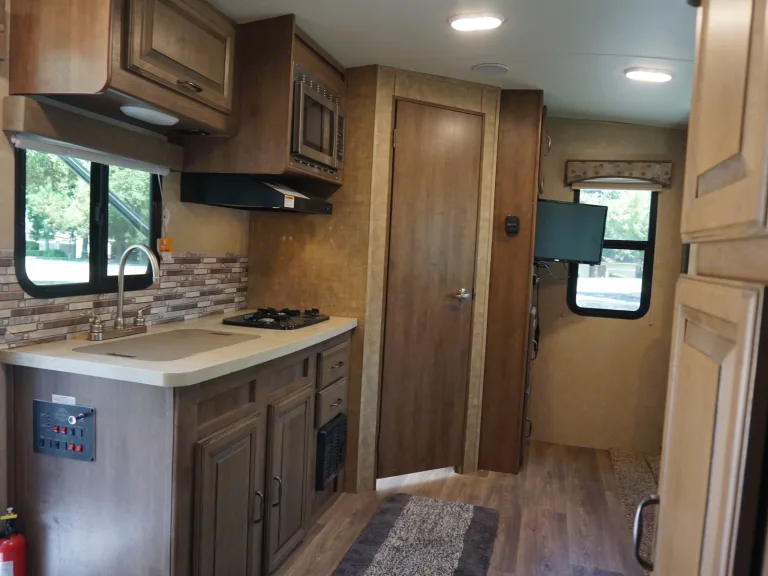 Step into the Fun Finder F-18 to find a closet, space for a TV and a wardrobe immediately to your left. The far rear corner holds a bathroom with toilet, corner shower, medicine cabinet and sink.